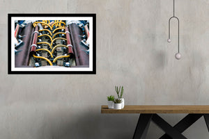 The view down the valley between the 2 camshaft covers details the feeding of ignition leads to the 12 spark plugs. The compressed view with the pop of the yellow wiring creates an interesting view of the British motor.